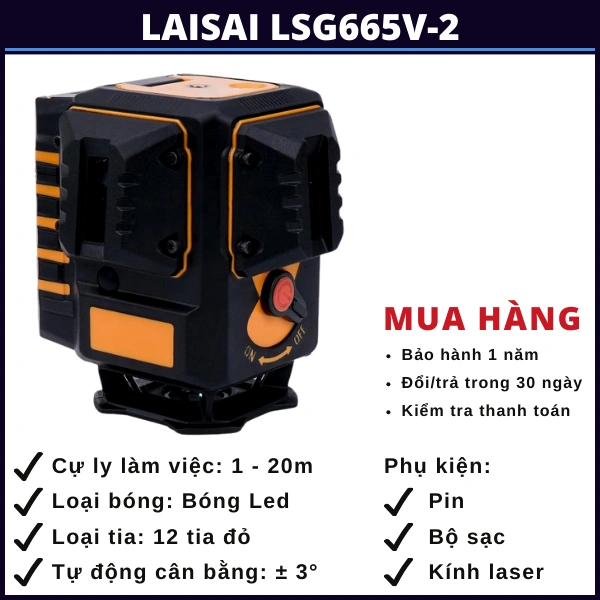 Laisai LSG665V-2 là dòng máy cân bằng laser 12 tia đỏ, được sản xuất trên dây chuyền hiện đại theo chuẩn Châu Âu của hãng Laisai. Với độ chính xác lên đến ±3mm/10m giúp máy có thể đáp ứng về độ chính xác cho hầu hết các công trình cần độ chính xác cao.