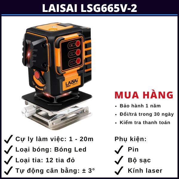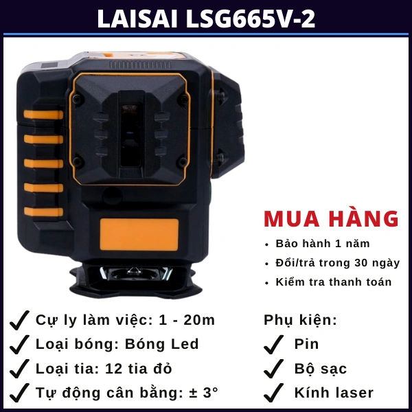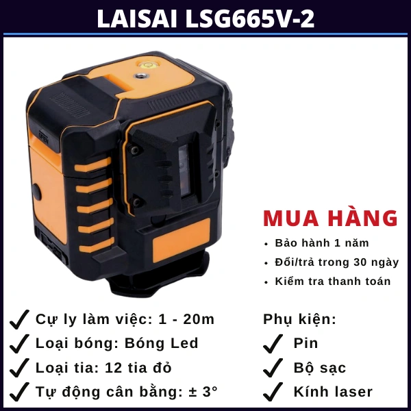 - 12 tia laser đỏ sắc nét: So với tia xanh tia đỏ kém hơn về phạm vi hoạt động và tính dễ phát hiện tia, tuy vậy không vì thế mà đánh giá thấp về chất lượng tia trên Laisai LSG665V-2. So với các máy laser cùng phân khúc của các hãng khác, LSG665V-2 vẫn vượt trội về chất lượng.